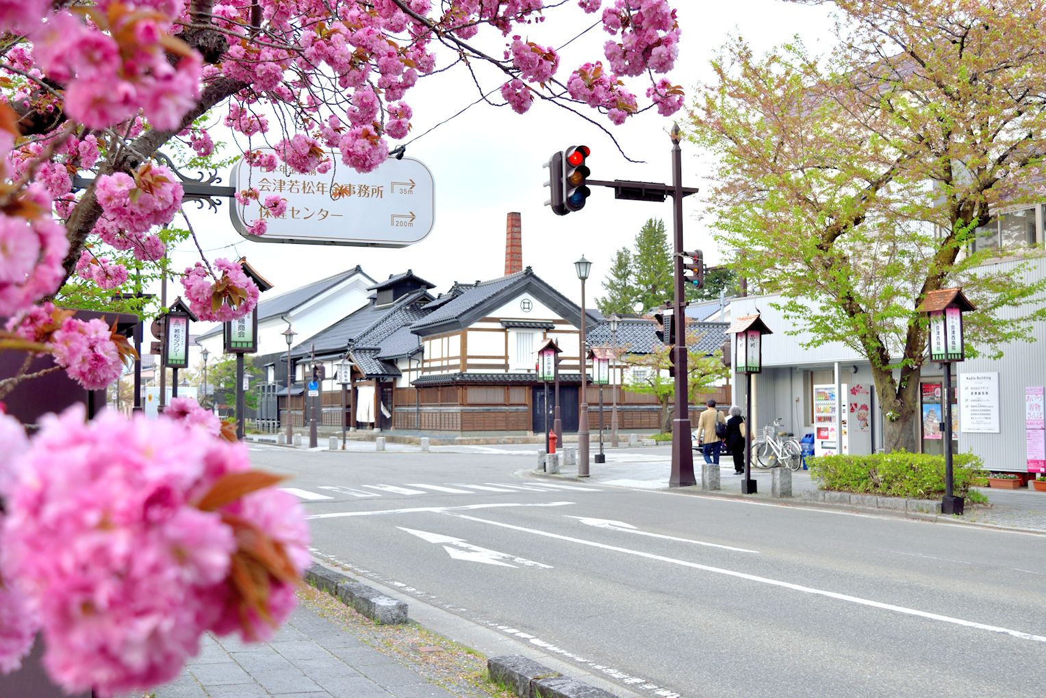 「鶴ヶ城」の北側「北出丸」より北に延びる「北出丸大通り」があります。街路樹には珍しく八重桜が植わっており、通りには造り酒屋の蔵等がある城下町らしい風情の通りになります。勿論、通りの南方を見ますと、真正面に「鶴ヶ城が」見え、静かに散策を楽しむ方にはもってこいの街並みです。