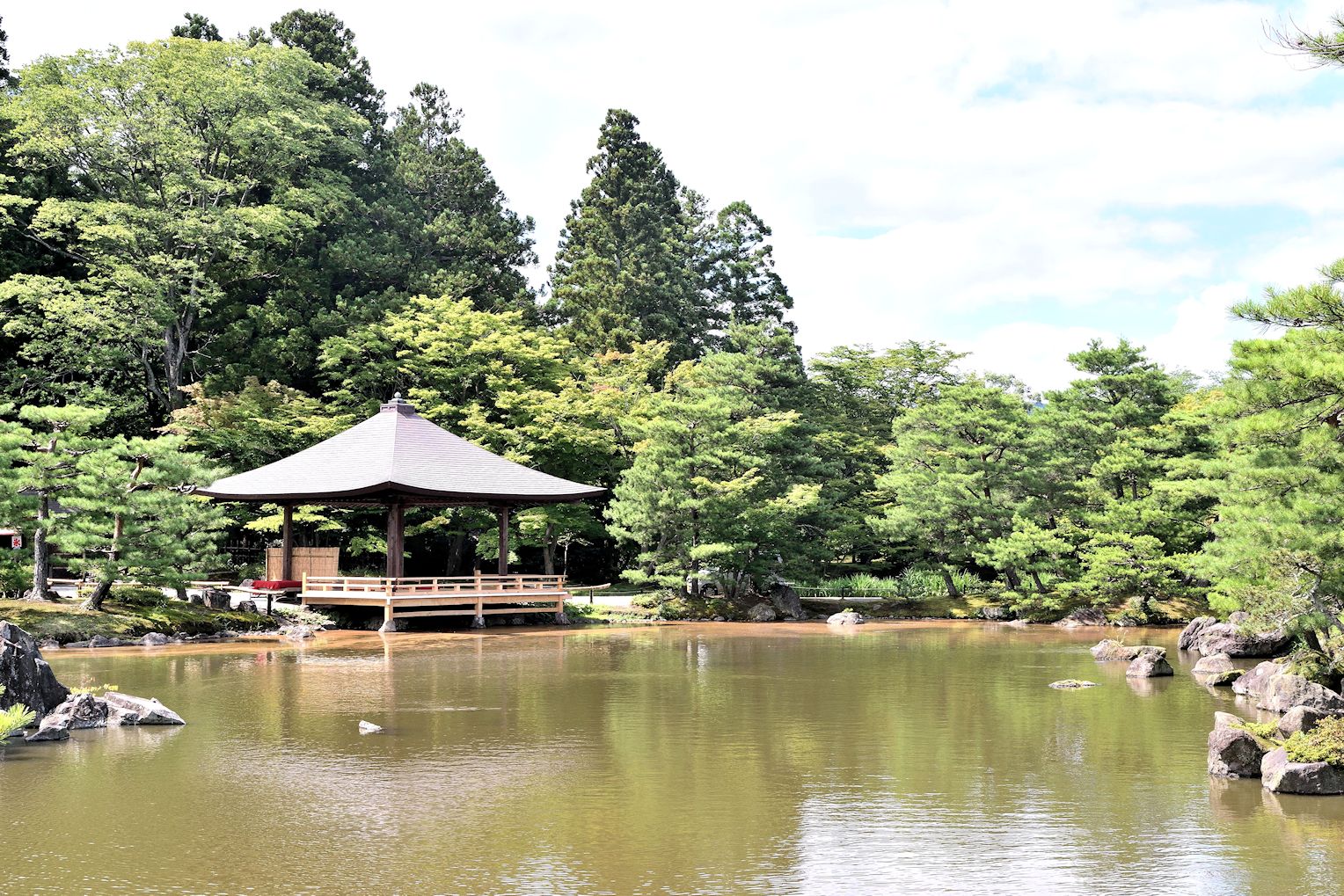 福島駅より西方に約7Km離れた所にある「浄楽園」です。総面積25千平方メートルの本格的な日本庭園です。入場は有料となります。赤松、五葉松、そして石を巧みに配置した庭園には、野鳥の鳴く声を聴きながら四季折々の草花を観賞しながら日本茶が頂ける茶屋もあります。