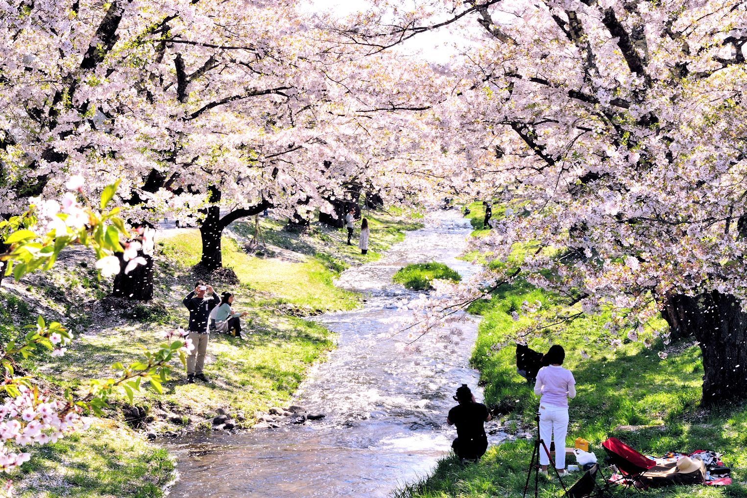 猪苗代湖北部東岸に流れ込む長瀬川の支流で、天狗角取山(てんぐすもうとり山)を源とする「観音寺川」は桜の名所で知られています。観音寺川の小川の両岸には桜のトンネルと言っても過言ではない程のソメイヨシノが咲きます。風が吹けば、いつか見た映画のワンシーンのように桜の花びら舞う景色が心を懐かしくさせてくれます。