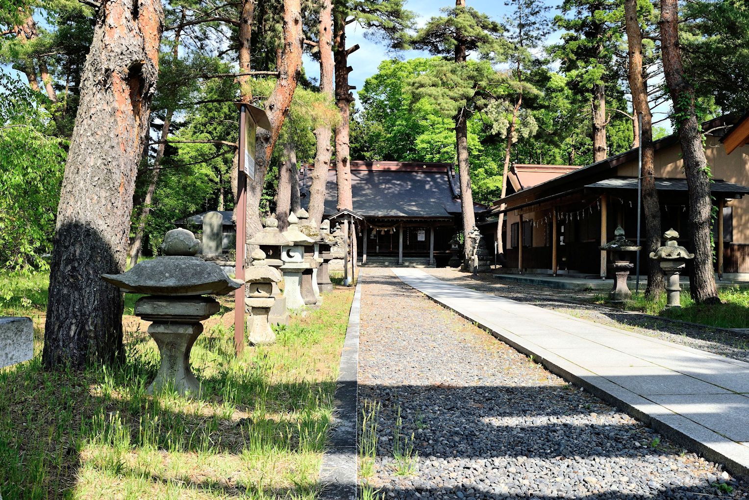 磐梯山の麓に広がる猪苗代湖、そしてその湖畔にある「小平潟天満宮」です。正確な場所は湖の北部東岸に位置し、長瀬川の河口付近の猪苗代町にあります。境内には夏の日差しが織り成す石燈籠の陰影が心地よく、松の小枝を通り過ぎる浜風が静かな時を運んでいく、そんな素敵な小さな神社です。