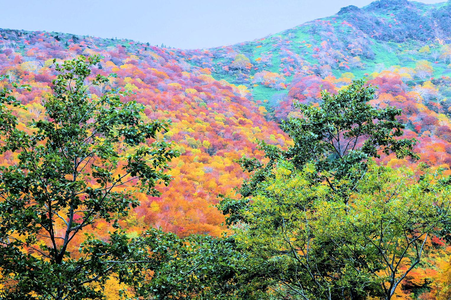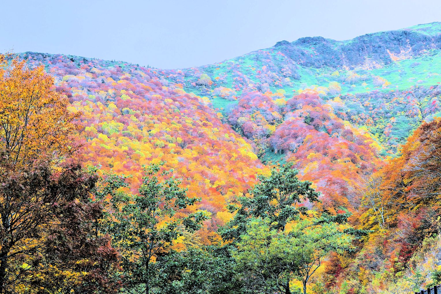 紅葉の安達太良山系です。安達太良山は磐梯山と並んで日本百名山に選定され、ともに活火山でもあります。標高は約1700mあり中腹は広葉樹が多く、秋には多彩な色の紅葉が楽しめます。頂上付近は森林限界を超え、樹木は殆どありません。安易に登山が楽しめそうに見えますが、本格登山の山です。