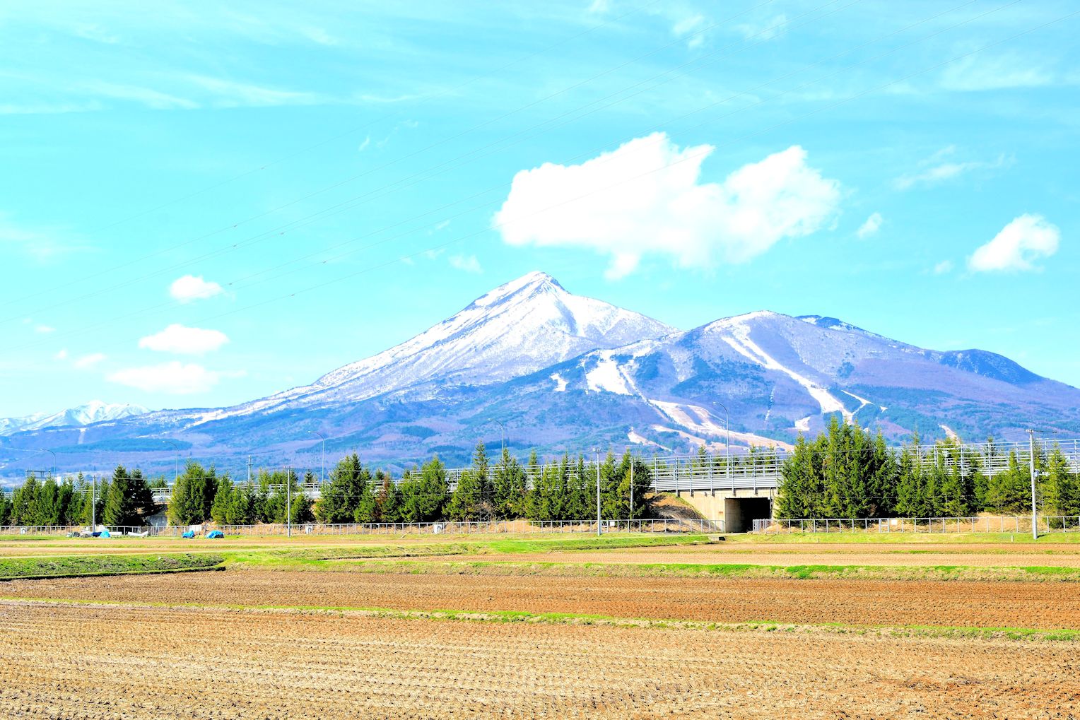 「会津磐梯山はよ〜♪」でお馴染みの磐梯山は会津のシンボリックな山で、昔からこよなく愛された山です。目前には猪苗代湖が広がり、田圃には春は緑、秋は黄金色、そして冬には白い絨毯が敷き詰められます。今は、東北自動車道「郡山JCT」より分岐した磐越自動車道(林の見える部分)が出来て便利なりました。