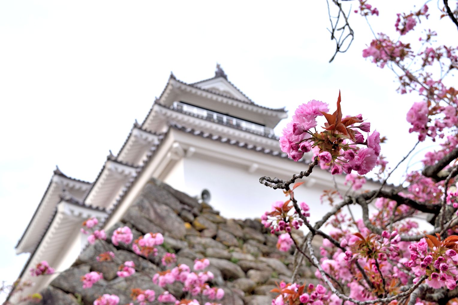 二本松城の箕輪門前の道が日本の道百選にも選定されています。春には流石に桜の名所だけあって、約2500本の桜がそこら狭しと咲き誇ります。また箕輪門から天守櫓跡の石垣と言われる山の上に向かって多少の時間差をもって花が咲きます。そして頂上からは山が多い為、一望し辛い二本松市が見渡せます。