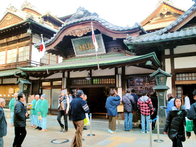 道後温泉のシンボルとして有名な道後温泉本館は明治27年に建築された三層楼のどっしりしたもので、近代的なホテルや商店街の中にあってひときわ風格のある姿を誇っています。浴場は二種類あり一階の大浴場を神の湯、二階の小さい方を霊の湯といい浴槽は花崗岩で出来ています。泉質はアルカリ性単純泉で日本人の肌に合う滑らかなお湯です。この道後温泉の良い所は泊まらなくても外湯を楽しめる事で、手ぬぐい片手に来る人も多く毎朝一番風呂に入ろうと、時を告げる太鼓の音を待ち構えている「朝湯会」のお年寄りや市民たちがいます。こうした地元の人々の伊予なまりを聞きながら、のんびりお湯に浸るのもまた旅情が感じられていいものです。二階に広間(脱衣場)があり湯玉印の浴衣を貸してくれ、湯上がりには炭火で沸かしたお茶が天目茶碗に入れられて出てきます。「又新殿」をはじめ、夏目漱石ゆかりの「坊っちゃんの間」、俳人・河東碧梧桐の書軸などをおさめた「展示資料室」があり観光客の人気を集めています。平日の観光客でも平均2000人位で、日曜祭日ともなれば倍以上と思える程行列が出来るので、夕飯前か早朝一番風呂が好ましく私はやや遅く入浴しました。それでも私は芋なのか大根なのか大変でした。アクセスは松山駅から路面電車で道後温泉駅下車徒歩約8分です。入浴料360円〜1500円位です。