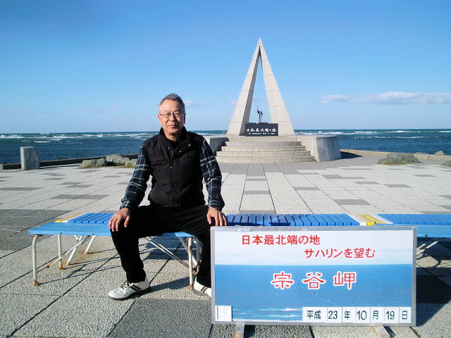 平成23年10月19日(水)やっと到達しました。私は人生60年で初めて来た!という感じでした。実際本当に嬉しかったです。一度は日本の最北端へ来てみたかったので、感無量です。この日は寒く若い男女のカップルと私だけで、運よくそのカップルに撮影をお願いできてナイスでした。余談ですがその方がもしこのHPを閲覧して頂けたとすれば、その節は有難う御座いました。我ながら函館からレンタカーで、よく頑張ったと自画自賛してます。後から調べましたが函館から高速道路利用の推奨道路経由で598.1Kmです。冬季の運転に自信のない方にはお勧めいたしません。またお時間のある方は、最北端の温泉も岬の近くにありますので是非どうぞ。
