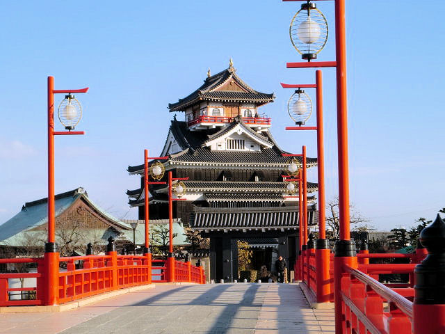 今話題になりつつある清州会議の清州城です。清州会議とは端的に言うと、信長の死後の後継者問題と領地再配分です。築城は室町時代前期で尾張・遠江・越前守護の管領、斯波義重(しばよししげ)が建てたと云われています。尾張守護所である下津城の別郭にありましたが、織田家の内紛で下津城が焼失した為清州に移転したそうです。尾張国の中心地となった清州は、一時期「織田弾正忠家」の当主織田信秀が清須奉行として居城した以外は、常に清洲織田氏(織田大和守家)の居城として尾張下四郡を支配する守護代織田家の本城として機能しました。家督は信友が継いで城主となりますが、主家である斯波義統(しばよしむね)を暗殺した事で信長と手を結んだ信光に殺されました。信長は信行を謀殺し信賢をも追放し、信長が実質上の支配者となりました。信長は桶狭間の戦にこの清州城から出陣しました。また徳川家康との同盟もこの地で行われました。信長は小牧山城に移動し、美濃国斎藤氏に備えるために清州城を番城にしました。信長の死後信雄が家督を継ぎますが、秀吉に逆らった為豊臣秀次の領内に吸収されました。その後福島正則が入城し、関ヶ原の戦以降勝利した徳川家康の四男・九男が入城し本拠地としました。徳川家康は清州城を名古屋に遷府させ城下町も全て変えたそうです。現在の天守は平成元年に模擬天守として建てられました。川と鉄道に挟まれた空間に朱色が映える橋の欄干と天守閣が凛々しくそびえ立っています。見どころは隣接した清州公園に信長銅像と、天守閣内資料館があります。アクセスは名鉄名古屋本線「新清洲駅」から徒歩約15分。JR東海道本線「清洲駅」から 徒歩約15分。城北線「星の宮駅」から徒歩約20分。東名阪自動車道「清洲東IC」から車で約5分