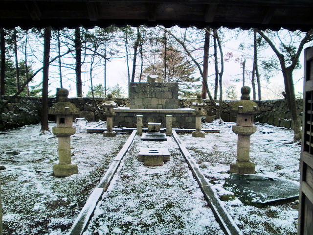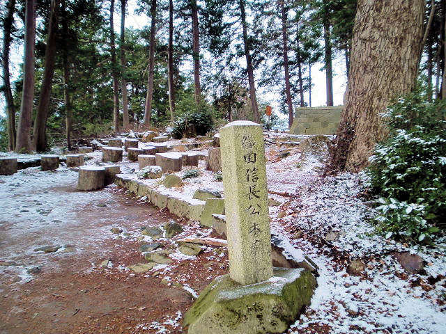 滋賀県近江八幡市安土町に位置する山城です。浅井・朝倉両氏を滅ぼし、武田勝頼を長篠の戦いで撃破した織田信長が天下布武を唱える最大の大名に登り詰めた証です。しかし目的はあくまでも岐阜城よりも京に近く、琵琶湖の水運も利用できるため利便性があり、加えて北陸街道から京への要衝に位置していた事から、「越前・加賀の一向一揆に備える為」あるいは「上杉謙信への警戒の為」などと推察されています。勿論配下の位置づけにもその采配が窺えます。琵琶湖の玄関口には明智光秀の坂本城東海道と、北陸道の分岐点に羽柴秀吉の長浜城が陣取っています。五重七階の豪華絢爛な天主(天守の事でキリスト由来の言葉)は、信長の西洋に拘った新しい城だったかもしれません。しかし三年後に起きた本能寺の変で天下統一を見ることなく横死し、安土城も原因不明の火災で焼失してしまいました。現在は城跡だけで当時の面影は微塵もありませんが、映画の「火天の城」で紹介された華麗な造りは近隣にある安土城天主、信長の館の模擬天主と類似しています。城跡は山頂にあり徒歩約30分かかります。尚、資料館及び信長の館は車で5分位の所にあります。見どころは織田信長公本廟、羽柴秀吉邸址で100選スタンプは必ず登城しなければなりません。アクセスはJR東海道本線「安土駅」より各資料館までは徒歩25分。城跡まで約30分