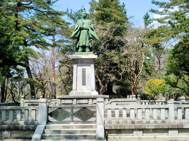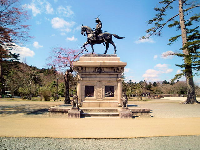 2013/04/11いよいよ東北は宮城県「杜の都」仙台です。仙台城(別名青葉城)は東北屈指の「東北大学」のキャンパスに隣接している為、当日は入学式だったのか新入生を勧誘する倶楽部の幟がたくさん上がっていました。車を本丸跡広場の西側駐車場(有料)に停め、「仙台城見聞館」では係の方にとても親切にガイダンスして頂きました。伊達正宗は関ヶ原の戦いの後、徳川家康の許しを得て千代(せんだい)に居城を移しました。慶長5年12月24(1601/1/28)に青葉山に登って縄張りを始め、地名を千代から仙台と書き改めました。彼が築いた仙台城は、本丸と西の丸からなる山城であり、天守台はありましたが天守(天守閣)はなかった様です。この事は時代の流行には合いませんでしたが、結果的に仙台城は「日本の最も勝れ、又最も堅固なる城の一つ」と言わしめるほど、この時代に比類ない堅城だった様です。実際徳川家康の居城江戸城に次いで2万坪と言う規模を誇る城だったそうです。今回の訪問では残念ながら大手門と隅櫓をカメラに収めることは出来ませんでしたが、大手門と隅櫓以外にも見聞するところがありますので是非訪ねて見ては如何でしょうか。名曲「荒城の月」の作曲者滝廉太郎が有名で、同曲作詞家の土居晩翠(どい若しくは、つちいばんすい)はあまり知られていない様ですが、彼の故郷の仙台城を舞台に歌ったと云われています。仙台市内には「晩翠通り」と言うのもありますし、「荒城の月」の歌詞で「千代の松枝・・」の千代は仙台からもじったと言う説もあります。詳細は不明ですが、この曲のモデルとされている城を紹介しておきます。豊後竹田(岡城)滝廉太郎、富山(富山城址)滝廉太郎、岩手(九戸城址)土居晩翠、会津若松(鶴ヶ城)土居晩翠夫妻。見どころは仙台城見聞館、伊達政宗像、石垣城壁等の遺構。アクセスはJR「仙台駅」よりバス「仙台城跡南」まで約25分、東北自動車道「宮城IC」から約15分