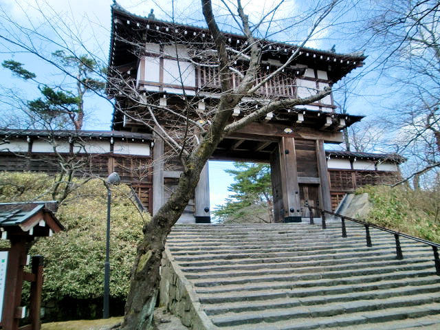 2013/04/11一路山形市の山形城跡に向かって多賀城跡を後にしました。行程は笹谷峠経由で約1時間30分位です。同行の旧友が「折角山形に来たのだから途中に避けて通る訳にいかない場所がある。一度は見るなり眺めるなりして行け!」と云われ、無理やり連れて行かれました。なんと山の峨々たる山壁の淵に寺があちらこちらにあるではありませんか。そこは四寺廻廊(しじかいろう)の一つ岩手平泉の中尊寺、毛越寺(もうつうじ)、宮城松島の瑞巌寺(ずいがんじ)と並んで巡礼寺とも修行寺とも云わる寺で、松尾芭蕉が「閑さや岩にしみいる蝉の声」と読んだ有名な句はこの寺での事であり、曾良(そら)の随行日記には「山寺や・・」と記されている事から、通称山寺(やまでら)と呼ばれる立石寺(りっしゃくじ)でした。時間があれば登るつもりでしたが、目的の山形城跡の閉館が迫っているので残念しました。これは事実ですが、実に完璧な言い訳です。旧友曰く登り坂は半端ではなく修行の為の寺なのですから、それなりの覚悟が必要であります。訪れる時は十分時間の余裕と体力をもって行かれる事をお勧めします。