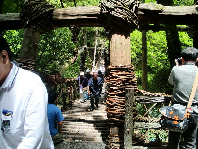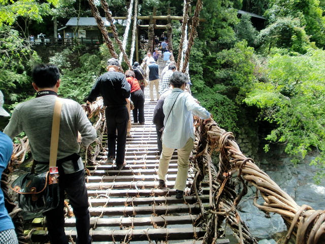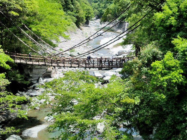 常にお城を追っているせいか、歴史の舞台や観光名称等を見逃していることが多いようです。今回の旅で始めから気になっていた場所が、平家の落人集落のあるこの「かずら橋」だったのです。徳島県三好市の大歩危(おおぼけ)から東に位置する山奥にある吊り橋です。今は多くの方に知られていて国の重要文化財に指定された日本三奇橋の一つで、国の有名橋100選にも取り上げられています。2013/05/15高知市から高知自動車道で大豊ICを下車して、祖谷渓(いやだに)を目指しR32を北上します。所要時間は1.5時間位です。R32より土讃線「大歩危」駅に向かって吉野川にある橋を渡り、そのまま山道を道なりに登っていきます。途中立ち寄りはしませんでしたが、平家屋敷民俗資料館があり、平家の資料や遺品が展示されています。安徳帝の御典医だった堀川内記の子孫代々の屋敷です。堀川内記は平家滅亡の折に一族とともに入山し、薬草の豊富な祖谷の地で医業と神官を務めた人です。庭には樹齢800年の老木がそびえ、江戸時代の民家をそのまま保存した館内には、鎧や旗、古文書、生活用具などが展示されています。平家屋敷を過ぎると5〜6分位で下りになり、約10分で大駐車場に到着します。かずら橋は、サルナシ(しらくちかずら)などの葛類を使って架けられた原始的な吊り橋ですが、現在は安全の為にかずらは装飾としてワイヤーを包み込む状態で使用されています。実際に渡ってみましたが、眼下が丸見えなので高所恐怖症の方は遠慮した方がよろしいかと思います。豆辞典としてサルナシマタタビ科マタタビ属のつる性植物で別名シラクチカズラ、シラクチヅルと言い、果実はしばしばコクワと呼ばれます。見どころは勿論、橋の度胸試し、周囲の景観。アクセスは土讃線「大歩危」駅から車かバスで約20分