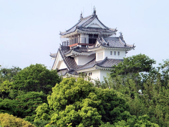 2013/05/16徳島もあと撫養城(むや城)を残すだけです。徳島市内中央から鳴門方面に向って約10Kmなので、急がなくても十分時間があります。撫養城は別名岡崎城、林崎城とも云われています。と話している間に到着しました。場所は妙見山公園内にあり、城跡地に模擬城が建てられています。元々模擬城は徳島県立鳥居記念博物館(鳴門市出身の人類考古学者、鳥居龍蔵の業績を記念した博物館)となっていましたが、2010年11月に徳島県文化の森総合公園へ移転し、現在閉鎖になっているので入館はできませんでした。古くは小笠原氏源氏の居城と伝えられますが、いつの時代に築城されたかは定かではありません。 『多聞院日記』に「三好之長の執事に撫養掃部助」という人物があり、この撫養氏が撫養城主の小笠原撫養殿のことで、当時の三好氏が鳴門の海上に睨みをきかせていたことがうかがえます。天正十年(1582)長宗我部元親が阿波へ侵入し、撫養城も長宗我部配下の真下飛騨守が守備をしました。同十三年(1585)豊臣秀吉による四国征伐に軍功のあった蜂須賀家政が阿波の新領主として入国し、阿波北部の要衝である撫養城は益田内膳正忠に守らせた。その後徳川幕府の一国一城令により、寛永十五年(1638)この城は廃城となりました。(『日本城郭大系』)既述の様に現在お城は閉鎖されていますが、公園内は整備され、花壇や女性のブロンズ像等が飾られています。見どころは妙見山公園、撫養城の景観、 桜の季節。アクセスはJR鳴門駅から徒歩約20分