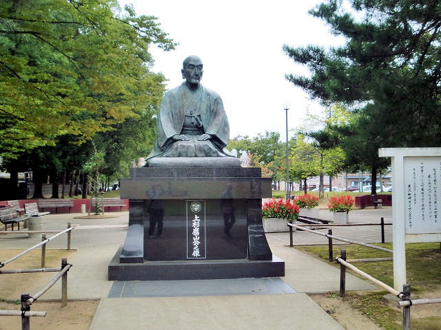 昨日の10/2夕刻には二本松市の友人宅に無事到着しました。2013/10/03本日はその友人と山形県米沢市にある上杉神社を訪問することにしました。二本松市から一般道で小一時間は旅人にとって丁度いいかもしれません。神社に着いて思ったことは、平日にしては観光客が多いのはやはりTVの「天地人」効果があったのかもしれません。神社といっても旧米沢城跡の中に上杉神社や春日神社が置かれていますが、城という括りで城下町観光は確かにお城ですが日本百名城への登録はやや難攻(独り言)かもしれません。いずれにしても上杉景勝、直江兼続の人気は今も上々です。歴史をひもとくと上杉謙信の病没後関ヶ原の合戦で西軍に加勢した景勝は会津120万石から米沢30万石に減封され、これにより米沢藩初代藩主上杉景勝が誕生しました。その執政を執ったのが直江兼続で君主と領民の為に心血を注ぎ、60年の生涯を閉じるまで現在の米沢の礎を築きました。米沢藩藩主は13代まで続きましたが戊辰戦争後米沢藩を廃し、米沢県(1871)を置きさらに置賜県(おきたま県)になり1876年には山形県に合併されました。豆知識として米沢藩9代藩主上杉治憲(はるのり)別名の鷹山(ようざん)は高鍋藩(宮崎県)藩主秋月種美(たねみ)の次男として生まれ10歳の時上杉重定の養子となります。17歳で米沢藩を襲封し財政の窮迫する米沢藩の再興に成功し、35歳で隠居するも72歳まで藩主治広の後見役として藩政を指導しました。鷹山公の名言「為せば成る 為さねば成らぬ何事も 成らぬは人の為さぬなりけり」は有名です。アクセスは奥羽本線(山形新幹線)「米沢」駅より徒歩約20分。米坂線南米沢駅から徒歩約10分。見どころは稽照殿(けいしょうでん、(宝物殿))上杉謙信像、上杉鷹山像、天地人像。