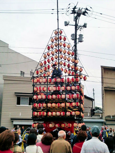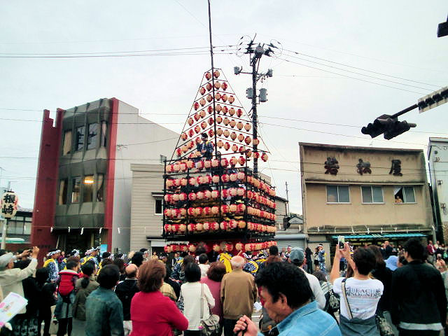 5日の本祭りは山車とは別に例大祭として最も重要な神輿渡御(みこしとぎょ)がありますが、見物としてはやはり山車巡行がメインになります。朝8:30頃の駅前を出発した山車の7町合同曳き回しは、昼12:00頃に根崎の交差点に到着し昼食の中休みになります。この日中の山車巡行には提灯ははずされています。昼食の中休みを終えた各町の山車は7町合同曳き回しを終了し、其々の町へと帰っていきます。そしてその日は其々が其々の町内にて曳き回し巡行が行われます。言うまでもありませんが、夜の巡行には再び提灯が取り付けられ火が灯されます。