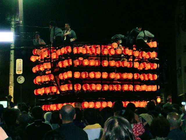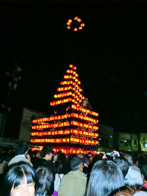 其々の山車には町名の入った高張提灯を前後に配し、そして山車の周りには約300余りの提灯がローソクで灯され、また屋根の上には約11m上空に飾り付けられた「すぎなり」と呼ばれる8個の提灯にも御神火が灯されます。各町は山車と共に山車に乗った囃子を受け持つ子若