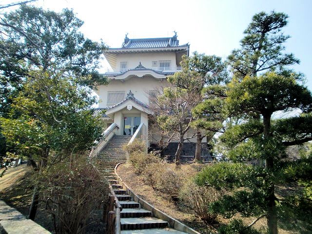 2014/03/17大多喜城から凡そ17Kmのところに次の目的地久留里城があります。大多喜での滞在時間は僅かでしたが千葉県に来て最初の天守を拝めました。現在13時ですが道中何があるか分かりませんので少し急ぎます。所要時間約50分。まもなく久留里城(君津市)の駐車場に到着です。駐車車両は2〜3台と少なく、まあ日祭日を外しての旅ですから当然と云えば当然ですが、んん〜閉館日の月曜日だったとはちょっと残念でした。因みに全国殆どのお城に携わる美術館や歴史博物館は月曜が休館です。駐車場から復元天守まで200m程の勾配を登城します。大袈裟な準備体操は必要ありませんが、足腰に軽いウォーミングアップや簡易の杖等を利用されるほうがいいと思います。私は普段から鍛えていますので必要ありませんでしたが、えらかった! やっとのことで登城しました。山頂には資料館や新井白石の銅像が設置されてあり、少し離れた小高い丘に天守が設けられています。生憎2月の豪雪で、一部破損したらしく中庭に入ることが出来ませんでした。しかし可愛い天守を見ることができました。沿革は、伝承では平将門の三男で東少輔頼胤(とうのしょうゆうよりたね)が浦田の妙見寺に参詣の際、夢の中でのお告げにより築城したと言われるようです。史実としての久留里城は、甲斐源氏の支族である上総武田氏の祖、武田信長が康正元(1455)年に上総守護代に任ぜられ、その翌年に真里谷と庁南(長南)の二城を築いた直後に築城されたと思われ、そして信長三男の信房に久留里城を与えたようです。この頃の久留里城は現在の久留里城の北方500mほどの峰続き上にありましたが、その後武田氏方の勝(すぐろ)真勝が城主のときに里見成義(実在に疑義があり、実際は実堯(さねたか)または義堯(よしたか)と思われる)により無血開城し里見氏の属城となったといわれています。アクセスはJR久留里線「久留里」駅より徒歩約25分。麓より登城徒歩約20分。駅から麓まではタクシーがお薦め。見どころは復元天守、資料館 新井白石像