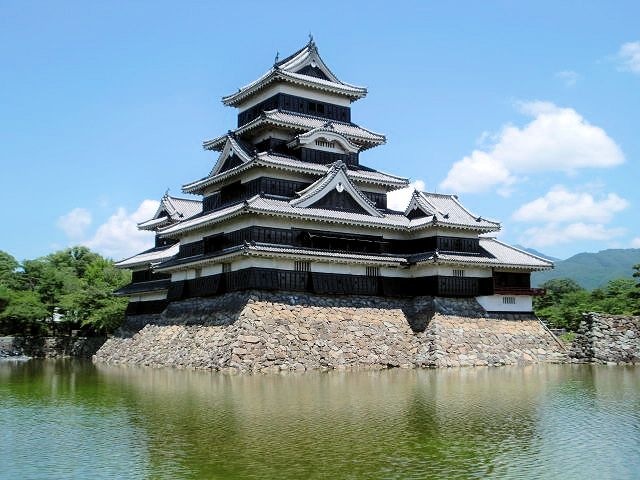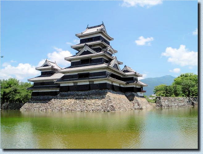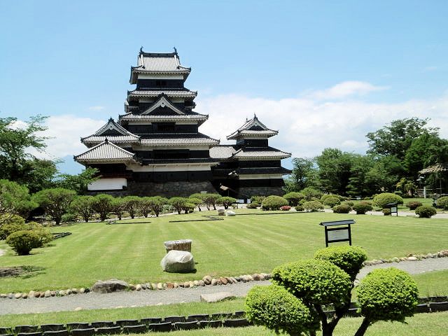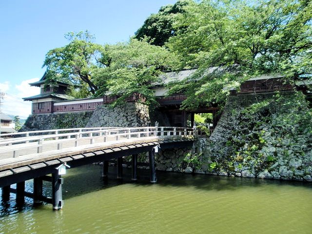 2014/07/01松代城から約50q、高速で行けば1時間も掛からない目と鼻の先です。本来、旅を満喫すべく醍醐味は旧道にありと誰かが云っていました。しかしそれも賛否両論と云うこと矢張り文明の力をフルに活用したほうがいいので、今回は目を瞑って鼻の先の高速道を択びました。松本城には11時を少し過ぎて堀に近い駐車場に着きました。駐車場を出て直近に珍しい食べ物を発見です。なんと云いましょうか幼少の頃に駄菓子屋で見たような、おかき風煎餅?味付けは醤油?それとも味噌がベースかな、手作りでなかなか美味しかったです。お店の名前は信州有喜堂です。本題の松本城は、駐車場から横断歩道を渡ったところに凛々しい姿を惜しげもなく披露しています。五重六階の天守は日本最古で姫路城、彦根城、犬山城と並び国宝城郭の一つとされています。天守櫓は黒漆塗りの下見板張りの為全体が黒く映り、どの角度からみても見応えがあります。また、周辺には草花や夏には残雪を頂きに雄大な北アルプスの山並みなど、四季折々の風情が味わえます。沿革は天正18年(1590)に小田原城の北条氏直を下した豊臣秀吉は天下を統一すると同時に、徳川家康を関東に移封しました。このとき松本城主であった小笠原秀政が家康に従い下総へ移りました。石川数正、康長の父子が代わって松本に入り、城と城下町の整備を進め近世城郭としての松本城の基礎を固めました。天守の築造年代は文禄2年から3年(1593〜4)と考えられています。豆知識として石川数正は戦国時代から安土桃山時代にかけての武将で大名でした。 酒井忠次と共に徳川家康の片腕として活躍しましたが、小牧長久手の戦いの後に徳川家を出奔して豊臣秀吉に臣従しました。信濃松本藩の初代藩主とすることが通説となっているのですが、何故徳川家から豊臣家に寝返ったのか、それとも間諜(かんちょう)、密偵(みってい)等の内部工作説があるとも云われていますが定かではありません。しかし、この事が起因してか徳川家康の江戸時代になって、些細な事件(大久保長安事件)により石川家は改易処分となっています。また、明治時代になってその時の怨念が天守を傾かせたと言う噂話がありますが、勿論物理的に地盤の沈下等の理由により傾いたのですが現在は修復されています。また天守は元々戦の為に築城されましたが、後世の平和な江戸時代に増築された月見櫓には権力の象徴としての部分の2面性を合わせ持っています。見どころは五重天守、玄蕃石(巨大石)、渡橋、松本市立博物館、近隣の旧開智学校校舎。アクセスはJR篠ノ井線「松本」駅からバスで8分「松本城」下車より徒歩約3分。長野自動車道松本ICから158号線で15分