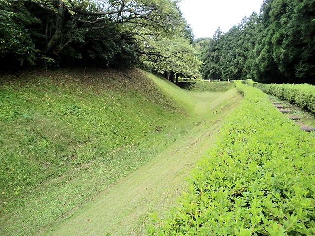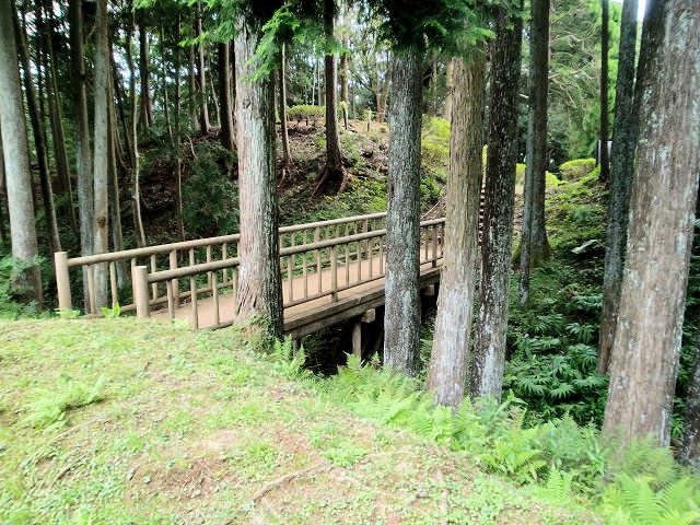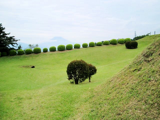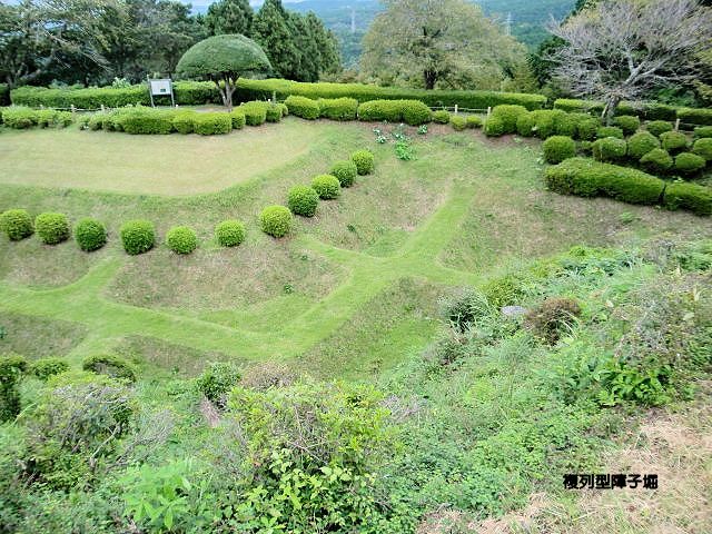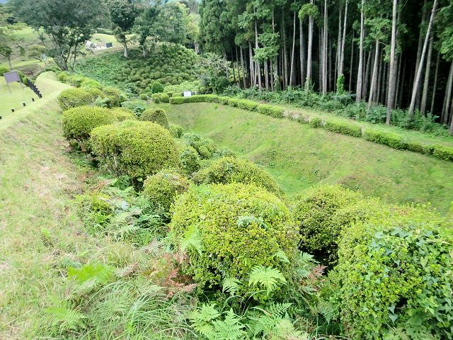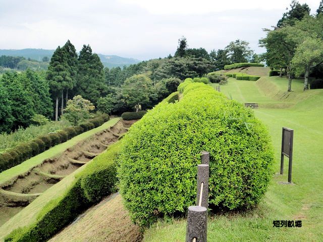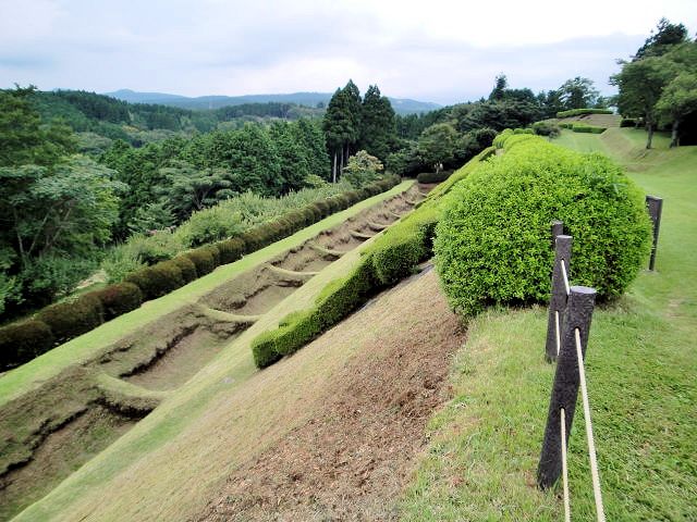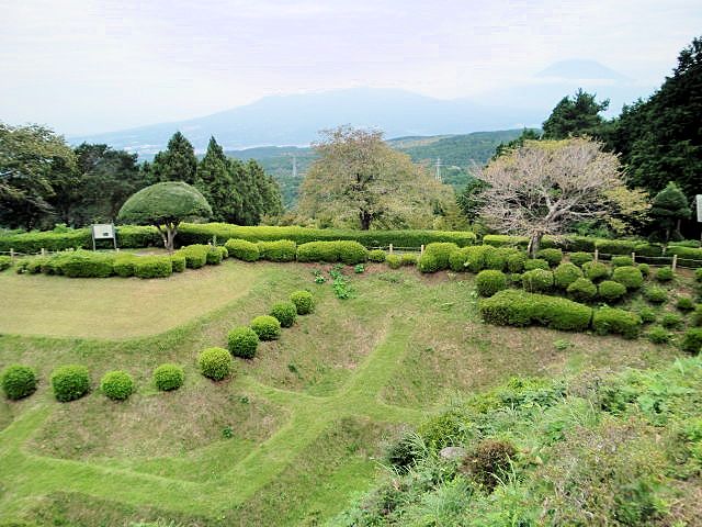 2014/9/20の朝、目が覚めて時計を見ると6時を指していました。出発するには決して早い時間でもないのですが、今日の走行距離を考えると丁度良い時間かもしれません。今回の目的地は本州では百名城登録地の最後になる静岡県三島市にある山中城を目指すことにしました。天候は曇り7時に出発すれば遅くとも10時には着けるでしょう。高速道路では2回の休憩を取り、40分遅れの10時40分到着です。まあ、慌てる旅でもないので安全が何よりの御褒美です。場所は沼津インターから約30分旧箱根街道を峠近くまで登りますが、峠道はGSがないので燃料の確認は怠らないようにします。山中城跡は箱根の地形と旧街道を挟んで曲輪が整備されています。西櫓、西木戸の物見台からは大自然に囲まれた美しい山々の中に富士山や天城連山の眺望を味わうことができます。癒しの空間としては見事なフレーズではありますが、残念ながら曇り空に時折の雨とは運がありません。沿革は永禄年間(1558〜1570年)に北条氏康により築城されました。このお城は北条氏の本拠地である小田原より西方の防衛を担う最重要拠点で、東海道を取り込む形で造られています。北条氏政の代に豊臣秀吉との関係が悪化すると、山中城を改修し防備を固める事になりますが、結局間に合わず未完成のまま豊臣軍を迎えました。 天正18年(1590)小田原征伐で豊臣秀次が率いる7万(4万?)の軍勢が山中城を攻撃し、守将である北条氏勝、松田康長、松田康郷、蔭山氏広、間宮康俊ら4千の兵は奮戦し、豊臣方も部将の一柳直末など多くの戦死者を出すものの、猛烈な力攻めの結果わずか半日で落城し、北条方の松田、間宮などの武将や城兵の多くが討死しました。お城は戦後になって廃止されました。現在は「古き」を偲んで、この公園として訪れる人々に歴史のロマンを物語っています。見どころは防御に石垣のない土造り(土塁や複列型障子堀、短列畝堀等の遺構(画像参照))の城。アクセスはJR東海本線「三島」駅南口より沼津登山東海バスで「山中城跡」まで約30分