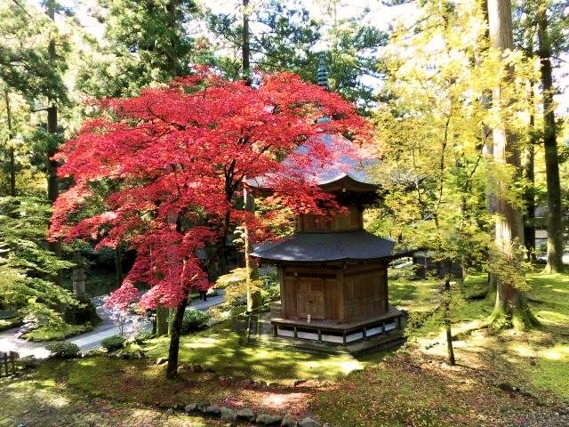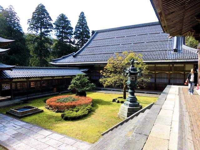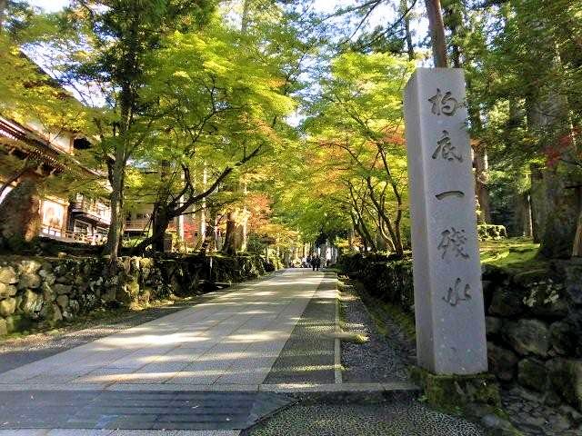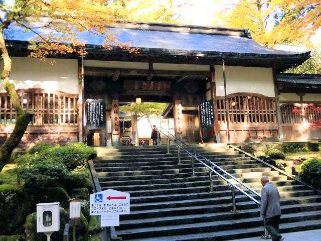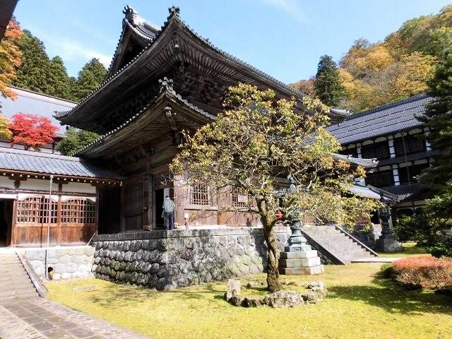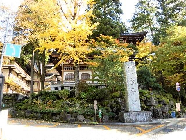 2015/11/05晴天の大野城を後にして車で走ること1時間、福井県の観光名所としては欠かせない、恐らく8割以上が訪れるであろう、曹洞宗大本山永平寺に到着しました。とは云っても小生は恥ずかしながら無宗派です。然し宗教の信仰に分け隔たりを作る必要はないので、全ての神様や仏様を信仰される人達に、厳粛に敬意を払う気持ちで訪問させて頂きました。歴史は今から約770年前の寛元2年(1244)道元禅師によって開かれた坐禅修行の道場です。道元禅師は正治2年(1200)京都に生まれ14歳の時、比叡山で出家し24歳の春には中国に渡り天童山の如浄禅師(にょじょう禅師)について、厳しい修行をされてお釈迦様から伝わった「坐禅」という、正しい仏の教えを受け継がれて日本に帰られました。初め京都に道場を作りましたが、寛元元年(1243)波多野義重公の要請もあり越前の国に移られ永平寺を開かれたのです。現在は曹洞宗の大本山として僧侶の育成と檀信徒の信仰の源になっています。豆辞典として、波多野義重は鎌倉時代中期の武将で波多野氏の一族です。父は波多野忠綱(忠経とも)で初名を宣政と言いました。北条重時の娘を妻とし、重時の被官として活躍しまた。義重は日本曹洞宗の開祖道元と早くから親交があり、深く帰依してその活動を援助し、地頭として所領を持っていた越前国志比荘に招聘(しょうへい)し、土地を寄進して永平寺の建立に貢献しました。現在、彼の子孫は曹洞宗の檀家筆頭に位置づけられています。所見は旅の疲れが癒され静寂感の中に溢れる憩いがあります。行く価値は十分ありました。見どころは七堂伽藍(しちどうがらん)、傘松閣(さんしょうかく)の絵天井大広間、瑠璃聖宝閣(るりしょうぼうかく)。アクセスはJR福井駅から、えちぜん鉄道勝山永平寺線にて「永平寺口」駅下車、京福バス(福井-永平寺線)車で約15分。北陸道福井北ICより約5分 JR福井駅よりタクシー30分。