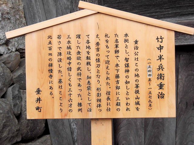 2016/03/05朝、寒暖の差を感じつつそろそろ冬眠から抜け出さないと身体が鈍ってしまうと思い、出かけることにしました。目的地は岐阜県不破郡垂井町にある竹中半兵衛所縁の地です。高速を使って長久手〜関ヶ原IC約1時間の行程です。因みに長久手から垂井まで殆どナビの奴隷と化し、頼もしい味方ではありますが私がロボットになっている様でもあります。現地では一応垂井町役場に立ち寄り竹中氏陣屋跡を再確認しました。現地は岩手小学校近隣で現存する木造白壁塗りの櫓門、頑丈な門扉、そして門に入って正面にある目隠しの石垣、濠などが当時の面影を留めていると云われています。個人的な所見から云えば華やかな城に比べて、此処の風景は正に戦の臨場感があります。歴史は岐阜県不破郡垂井町(美濃国不破郡岩手)にあった江戸時代の陣屋です。安土桃山時代には岩手城と呼ばれていましたが、江戸時代に竹中氏が旗本身分に留まったため城は陣屋と呼ばれるようになりました。別名は竹中陣屋や岩手陣屋とも呼ばれています。羽柴秀吉(豊臣秀吉)の軍師(参謀)であった竹中重治(竹中半兵衛)の子である竹中重門が築いたものですが、敷地を囲む大規模な堀(水堀等)と石垣などもあり、世に言う陣屋というものより小規模な城と言ったほうが正しいのかもしれません。元々、竹中氏の居城は堅固な山城である菩提山城(ぼだいざん城、別名岩手山城)でしたが、平時には不便なことから、麓に岩手城として築いたのが此の竹中氏陣屋です。竹中半兵衛の人物像については、豊臣秀吉の軍師として名を天下に知らしめた美濃生まれの戦国時代の武人です。正式名は竹中重治ですが、通称竹中半兵衛と呼ばれていました。竹中遠江守重元の長子であり、20才で斎藤竜興(たつおき)の居城稲葉山を陥しいれ、永禄10年に織田信長の配下である木下秀吉(豊臣秀吉)の謀将となりました。重治は武略に於いて当代無双と称され兵道の奥義を秀吉に伝え、軍事に多大な貢献をしました。天正7年(1579)36歳に没しました。法号は深龍水徹(しんりゅうすいてつ)と言います。半兵衛の墓は兵庫県三木市平井にありますが、この禅幢寺にもあります。長男重門が菩提を弔う為、三木より移葬したそうです。見どころは竹中氏陣屋跡、半兵衛の墓(禅幢寺(ぜんとうじ))、菩提山城跡、菁莪(せいが)記念館。アクセスはJR東海道本線垂井駅よりタクシー15分。名神高速関ヶ原IC下車365線を北上し、21バイパスを経て長畑交差点より約10分。