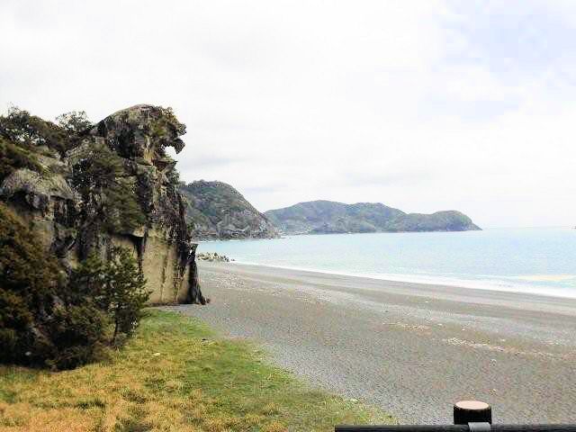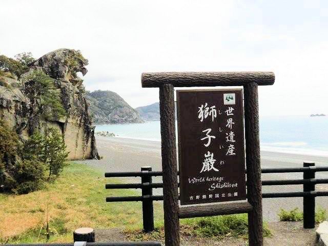 2016/04/05「獅子岩」は鬼ヶ城から約10分(徒歩35分)南方に位置します。「七里御浜」(しちりみはま)に面した岩場にそびえる巨岩が獅子の形に似ていることから名がつき、国の天然記念物として名勝にも指定されています。また近隣に流れる井戸川の上流に、今回は訪問出来ませんでしたが、大馬神社(おおまじんしゃ)と言う神社がありますが、この「獅子岩」を狛犬に準えて境内に狛犬は存在しないのだそうです。そしてこの「獅子岩」のある「七里御浜」は鬼ヶ城の南から三重県と和歌山県の境にある熊野川(新宮川)の川口まで、七里(約21km)に渡って続く砂浜海岸になります。熊野参詣の旅人が歩いた熊野古道伊勢路として世界遺産に登録されています。本日は晴天にも恵まれ非常に良い景観をみせて頂きました。感無量です敢えて云うならば人生はタイミング、特に一期一会の旅ですから幸運に感謝します。「獅子岩」続いて訪ねた先は「花の窟神社」(はなのいわや)です。「獅子岩」から徒歩でも僅か10分程度ですが、私は車での移動です。「花の窟神社」は、巨岩を御神体として祀る神社で、国産みの女神であるイザナミノミコトを葬った御陵として、日本書紀に記されています。毎年2月2日と10月2日に行われる例大祭「お綱かけ神事」でも知られています。白く輝く巨岩を祀った古代からの聖地として崇められています。御利益は参詣者の心がけと気持ちですので、何がとは云えませんので御了承下さい。注釈> 今回の眺望画像は全てR42号線沿いからです。松本峠(鬼ヶ城のある半島)から望む景観とは異なります。見どころは獅子岩、七里御浜、花の窟神社。アクセスはJR「熊野」駅より徒歩約20〜30分。