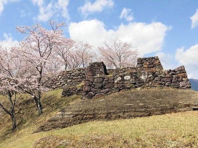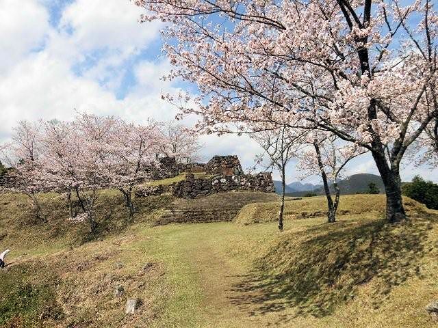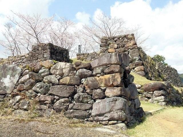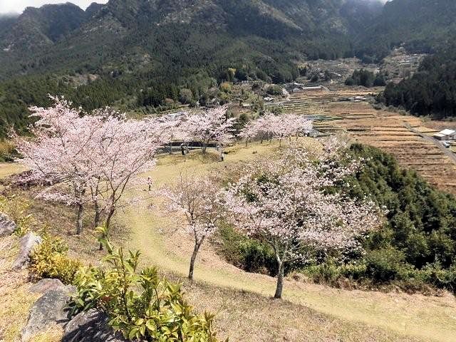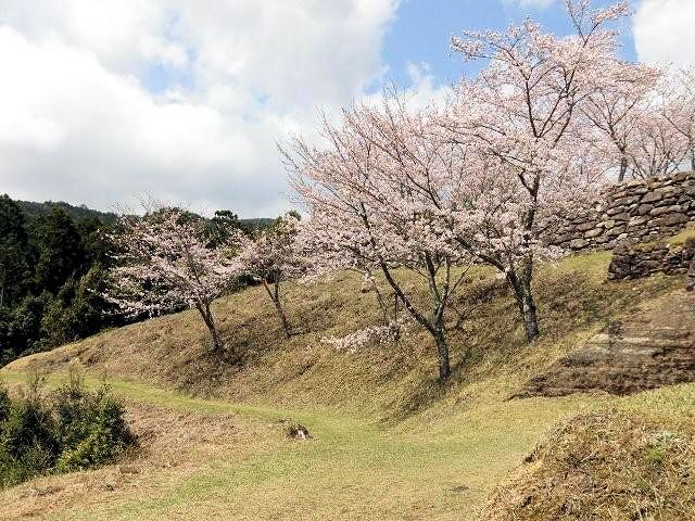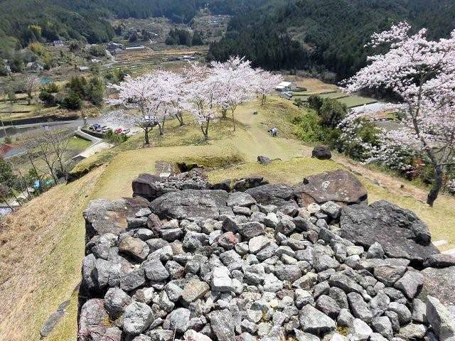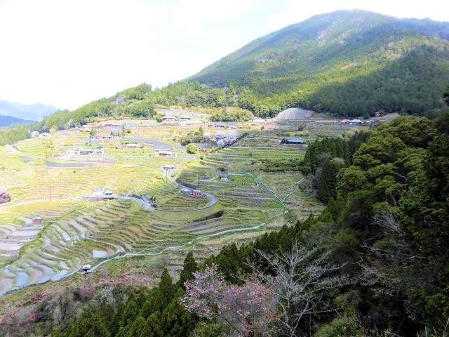 2016/04/05「花の窟神社」から車で走ること約1時間、紀和町赤木城跡に来ました。豊臣秀吉時代の築城名手の藤堂高虎が「天正の北山一揆」を制圧するために築いた城です。現在は標高230mの丘陵地に築城当時の遺構を示す石垣が残り、近年は天空の城として脚光を浴びています。日本の「天空の城」と称されているのは、竹田城跡を始めとする遺跡と比べると規模的には大きくはありません。それが幸いしてか登城の難易度が低く、観光客には嬉しいかもしれません。赤木城の沿革ですが、「紀伊続風土記」「倉谷家文章」などから 天正16年(1588)大和大納言(豊臣秀長)の北山攻め後、時の北山代官(藤堂佐渡守のちに和泉守高虎)が築きその地を統治しましたが、その際地侍を中心とした一揆が起こり加担した者をを赤木城の西方の田平子峠(たびらこ峠)で斬首し獄門にしました。藤堂高虎は文禄4年(1595)四国伊予三郡を与えられるまでの11年間、北山付近に在居し城郭の整備をしたものと考えられています。「天空」と云えばもう一つ違った風景が此の地に存在していました。それは、丸山千枚田です。江戸時代に築かれた日本最大規模の棚田ですが、かつては2240枚もの田があったと言いますが、今は残念ですが過疎化などで減少したようです。それでも現代では1340枚の水田が復活しており、四季折々の美しさを見せています。私も初めて見ましたが、「田圃」にこれ程感動するとは思いませんでした。また、季節や時間によっては、きっと変わった一面を見せてくれると思います。見どころは、赤木城跡(桜並木)、丸山千枚田。アクセスはJR「熊野市駅」より車でR42、R311、R40若しくはR760を経由し約40分で丸山千枚田。そこより更に10分で赤木城跡