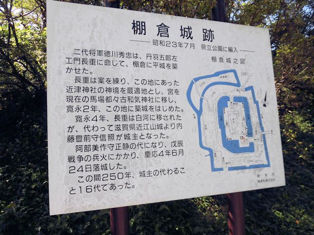 2017/09/15 浅川町から然程離れていない棚倉町にある棚倉城跡が本日のメインということになりますが、到着時間は正午過ぎなりました。 城跡はお堀のある公園ですが、県立(昭和23年編入)公園として指定されています。 周辺は堀と土塁に囲まれた敷地に樹木が四季を彩り、イベントを催す場所としては格好なスペースです。 そのほか城跡の大欅は福島県指定天然記念物に指定されています。 沿革は、元和元年(1622)常陸国古渡より棚倉に移封された丹羽長重は、幕府より築城の命を受け寛永元年(1624)、近津明神(都々古別神社)を馬場の地に遷宮し、翌2年、その跡地に棚倉城の築城に着手し、寛永4年(1627)に完成しました。 慶応4年(1868)戊辰戦争で落城するまでの240余年間8家16代の城主交代があり、お堀に住む大亀が水面に浮かぶと決まってお殿様が転封されたということから、別名「亀ケ城」ともいわれています。 土塁の上には南北朝時代の板碑や棚倉城規模碑、畑俊六(はたしゅんろく)元帥終焉の碑などがあります。 また、西側外堀跡には約160mにわたる石垣が残っています。