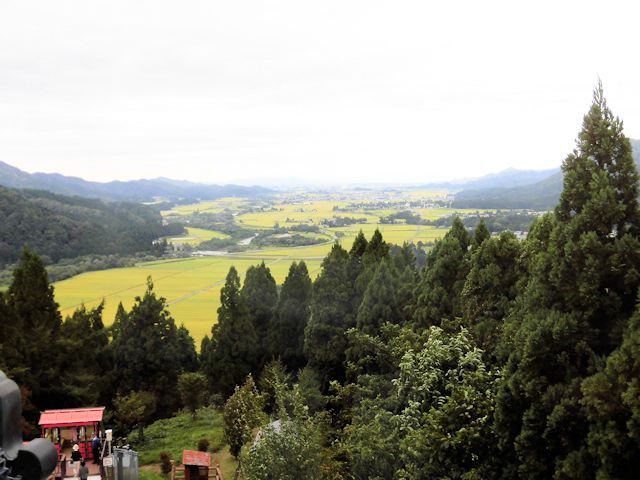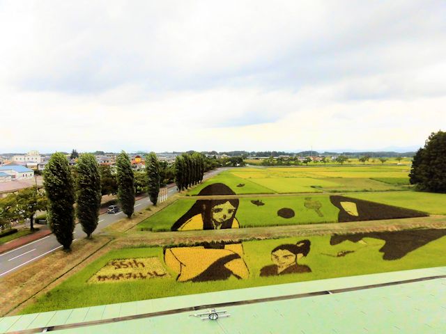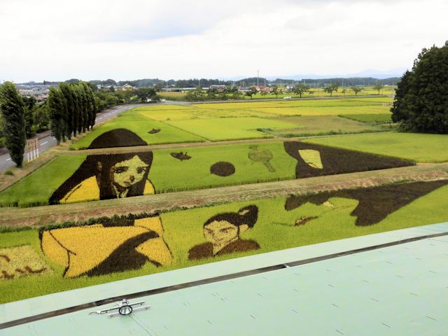 2017/09/16 東堂山満福寺の羅漢さんを後にし、友人より「田んぼアートを見た事があるか」と聞かれ、鏡石町にある田んぼアートを見に行くことにしました。 田んぼアートは田んぼをキャンバスに見立て、色の異なる稲を植えることで巨大な絵や文字を描いた田んぼの事です。 大規模なものの多くは斜め上から見る前提で図案を歪曲設計し、これに基づいて遠近を考慮して植えられます。 1993年に青森県南津軽郡田舎館村(いなかだて村)で村興しの一つとして、田舎館村役場裏手の田んぼで創められ、2010年以降になるとこれが日本全国にまで広まり、現在は「全国田んぼアートサミット」も開催されているようです。 今回、お世話になっている友人宅の福島県にもあると言う事で見学に行って来ました。 ネットやTVで観ることがあっても、なかなか実際に見るチャンスがなくラッキーです。 満福寺から車で25分、時刻も15時を少し過ぎた程度で明るさも上々、観覧するには最高な状態と条件揃いです。 観覧場所は田んぼに隣接する図書館の4階展望室を見学者に開放しています。 いよいよ田んぼアートとご対面とも云うべき瞬間です。 まさに何これの世界です。作品は「一寸法師」で感動の一言! 平成24年から始まった鏡石町の田んぼアートは歴史も浅く規模もそれ程大きくはありませんが、鏡石町のコンセプトでもある「窓から眺める絵本・もう一つの図書館」として、今後も童謡、童話、唱歌をテーマに頑張って良い作品を期待しています。