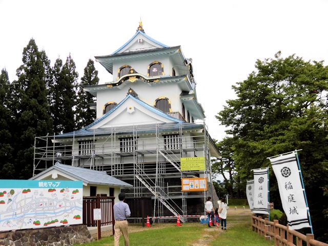 2017/09/17 今日から場所を秋田県に移し、新たな発見を求めて出発です。 時刻は午前9時、朝食をコンビニで簡単に済ませ、東北自動車道を福島県より北上し宮城県の「古川IC」経由で秋田県湯沢市方面を目指します。 目的地の稲庭城には正午過ぎに到着です。 登城はスロープカー(ケーブルカー)を利用して登りますが、あまりの急勾配に肝を冷やしながら、漸く頂上に着きました。 城は三層四階建ての模擬城兼資料館ですが、29年の歳月が経っているにも関わらず妙に新鮮な建物です。 歴史は、鎌倉時代初期に小野寺氏が初めて築城しました。 室町末期に沼館城に移るまで本拠とし、いわば小野寺氏創業の城です。 その後小野寺氏は横手城に移り、稲庭城はその支城となりますが、戦国期に横手盆地に侵攻してきた山形の最上勢に攻められて落城しました。 城内には郭跡、堀切、櫓台跡などが残っています。 城跡の詳細についてはスロープカーを使わず登山道をお薦めします。 また訪れる方には是非一度は味わって貰いたいのは、稲庭うどんです。 何故ならば、ここは稲庭うどん発祥の地なのです。