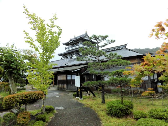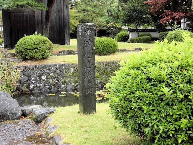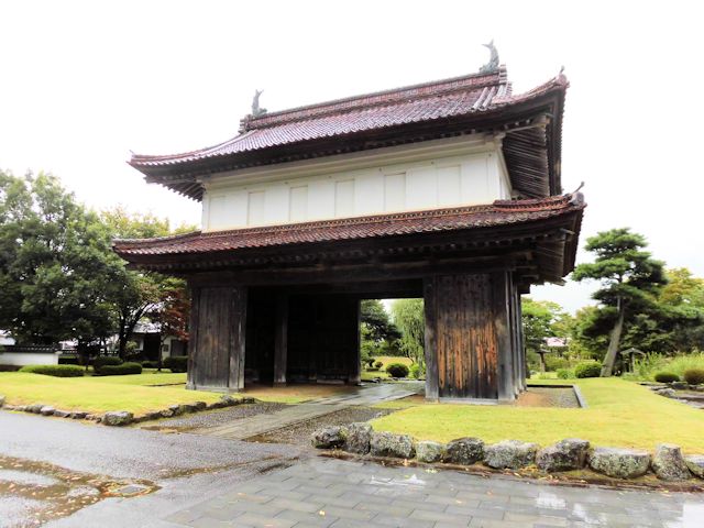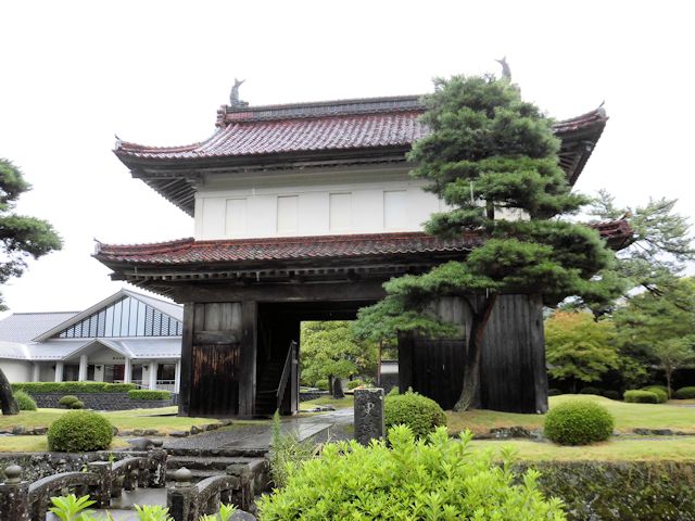 2017/09/18 由利本荘から日本海沿いに南下して、目標は酒田市の松山城に向います。 国道7号線を走りながら右手に日本海、左手には鳥海山と、こんな機会ひょっとしたら二度とないかもしれません。 見納めと云うと寂しですが、これからも一期一会の旅は続きます。 いよいよ酒田に着きます。 所要時間3時間超と台風の吹き返しの中、友人は黙々と運転に専念、お疲れ様です。 出羽松山城跡は松山歴史公園内にあり、時代を帯びた大手門が威容を誇って私たちを迎えてくれました。 [歴史]庄内藩2代藩主酒井忠当より領内の飽海郡(あくみ郡)中山村を、庄内藩の支藩として初代松山藩藩主酒井忠恒に分与され、中山陣屋が構えられました。 後に中山を松山と改め松山陣屋なります。 そして松山城は天明元年(1781)に松山藩3代藩主酒井忠休によって築城が始められ、それまでの中山陣屋より移り、7年の歳月をかけて完成したようです。 宝暦10年(1760)に、忠休は西の丸若年寄となり5千石加増され格式も城主になりました。 戊辰戦争では、宗家の鶴岡藩と行動を共にして奥羽越列藩同盟に加わり、官軍と戦うこととなります。 廃藩後大手門を除き、建物は取り壊されました。