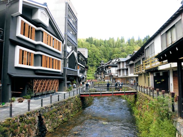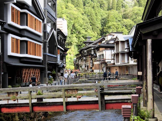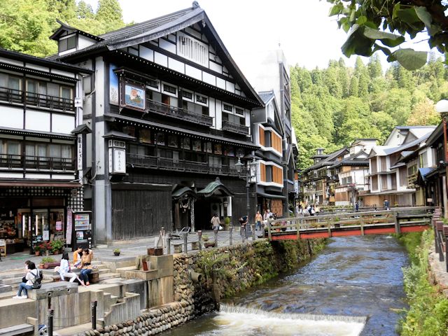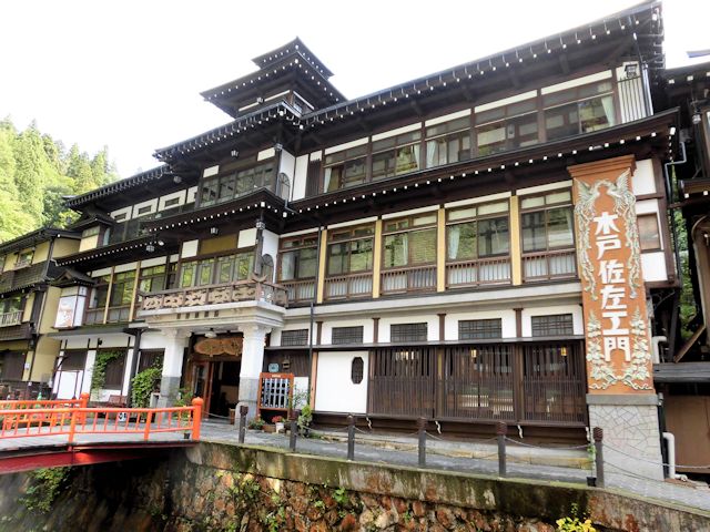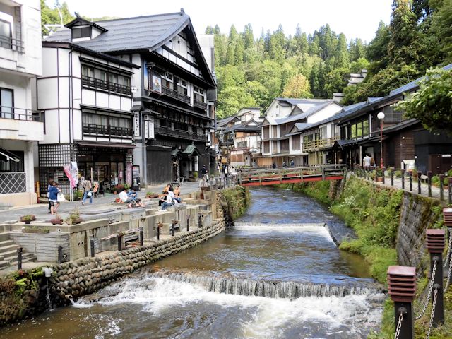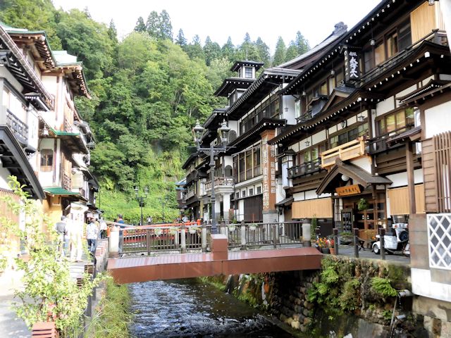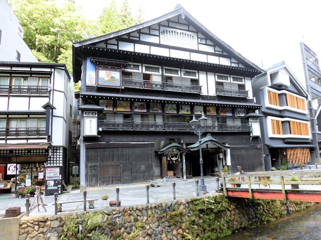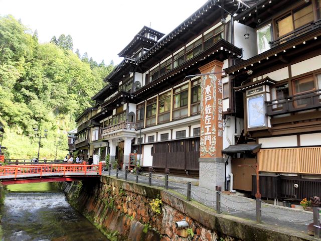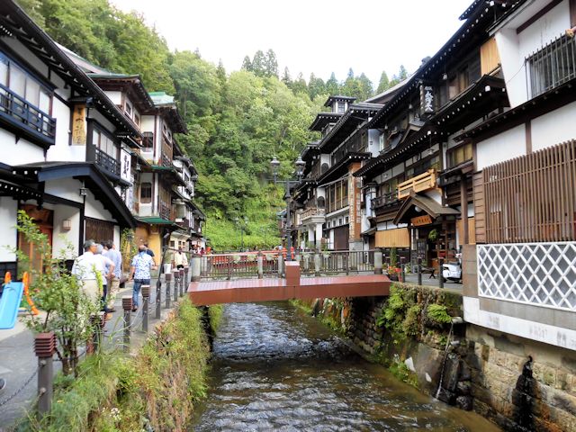 2017/09/18 山形県酒田市の史跡巡りも終えいよいよこの旅も帰路になります。 途中の尾花沢の銀山温泉街へ約2時間の行程、暫しの休息タイムで温泉街の古い町並みを見学です。 明治なのか大正なのかは分かりませんが、記録写真や映像等の参考資料からそれらの時代雰囲気が窺えます。 たしかに銀山温泉のキャッチフレーズに「大正ロマンの風情溢れる温泉郷」と謳っています。 パンフレットなどの写真よりイメージするより規模は小さく、実際の川沿いの温泉街は散策には最適ですが、宿泊客以外は駐車場もなく車で入って行けません。 それでも建物や雰囲気なるほど素晴らしいものがあります。 [歴史]開湯は寛永年間に、かつてこの地にあった「延山銀山」の工夫が銀山川の中に湧いている温泉を発見したことによります。 この「延山銀山」については1456年に発見され、江戸時代には幕府直轄の鉱山となって盛んに掘られ、1700年頃にはほぼ掘り尽くされ、その後起きた山崩れ等で1689年に廃鉱となっています。 「延山銀山」が閉山した後は湯治場として賑わいましたが、1913年の大洪水により温泉街は壊滅しました。 その後、地元財界の力で復興し、その時に現在の温泉街の街並みが作られました。 そして1968年11月19日、国民保養温泉地に指定されています。 [豆知識]銀山温泉は1981年のNHK朝の連続ドラマ「おしん」の舞台になった場所で、それをきっかけに全国的に有名になりました。