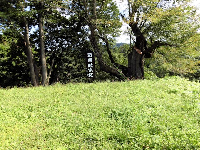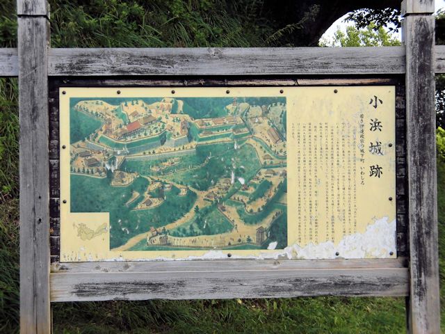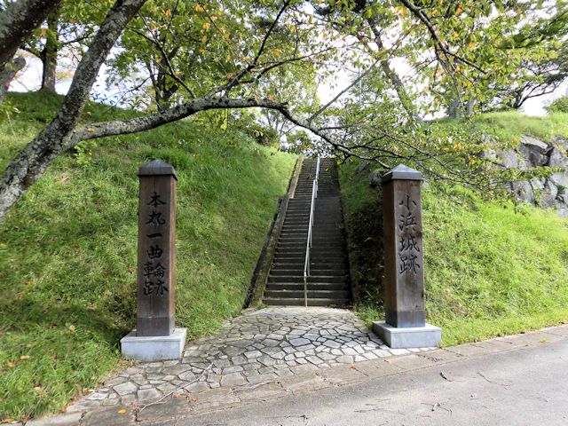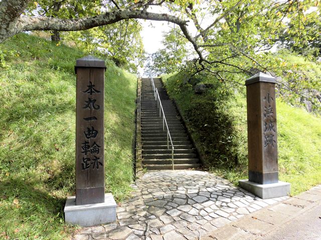 2017/09/19 晴天に恵まれ、気持ち良い朝を迎えてコンビニのイートインでコーヒーの香りに包まれます。 都会とは違い何かいい気分でのんびりします。 今日は友人(福島県二本松在住)が日頃から気になっている所に同行します。 場所は二本松市内にある「小浜城」(旧安達郡岩代町小浜)です。 現在の二本松市役所岩代支所の駐車場裏まで分かっていたので、周りを探索してみる事にします。 少し登って行くと小高い丘のようなところに石垣と石段、そして入口には二本の門柱があり、一本には小浜城跡と記されていました。 恐らく此処が目的の地でしょう。 石段を上がっていくと、草が生茂った広場に石碑がある程度で遺構らしきものは石垣以外何もみつかりませんでしたが、眺望するには良い所です。 [沿革]小浜城は大内氏の居城でしたが、大内定綱の代に伊達政宗に攻められ落城しました。 政宗は会津侵攻(会津の芦名氏)の拠点として、年天正13年(1585)から翌年にかけてこの城を居城にしましたが、以後は白石若狭守が城代としていました。 その後豊臣秀吉の奥州仕置きにより小浜城は蒲生氏郷(がもううじさと)に与えられ、家臣の蒲生忠佐衛門が城主となりました。 現在も城跡には忠佐衛門によって築かれた石垣が残っています。 尚、若狭(現福井県小浜市)にある同名の小浜城との関係ですが、大内氏はもともと若狭小浜の出身であったことから地名を小浜にしたそうです。