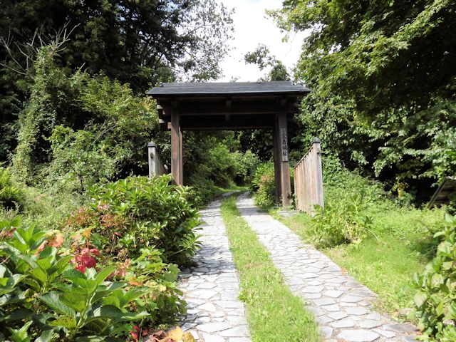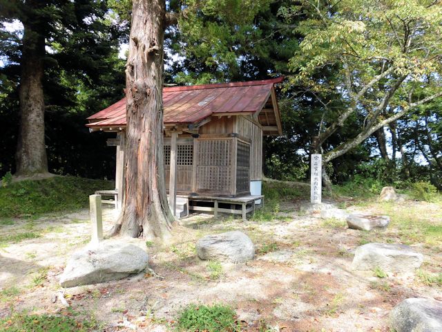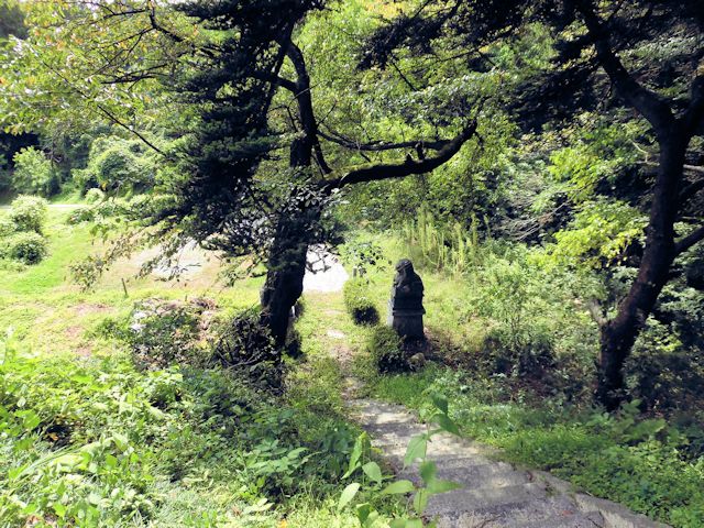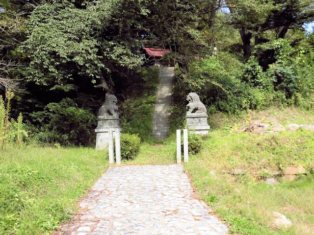 2017/09/19 二本松市の小浜城跡にあった城郭案内版の中に「宮森城」と言う城の場所が記されていました。早速行くことにします。 「小浜城跡」より南に7~8分走ると道路から山道に入る脇に案内板があり小浜川に沿って北に突き出した急勾配の道を上がった丘陵にありました。 石畳を登ってみると一見武家屋敷のような小さい門、更に進むと狛犬が私たちを迎えてくれました。 城内というより此処は神社の境内のようです。 そして宮本家祖大内氏城跡の石碑が、その鳥居と摂社の傍らにありました。 [歴史] 「宮森城」は、応永3年に宇都宮氏広によって築かれ、文明3年には「四本松城」(しおのまつ城、小浜城跡より北東にやく1.5Km)の城主石橋氏の重臣大河内修理が修築しました。 戦国時代に主家石橋氏を凌ぐ勢力へと成長した小浜城主大内義綱は、天正8年に主家と大河内氏を倒した後に「宮森城」へと居城を移し、塩松一円(現二本松市小浜一帯)を領しました。 天正13年大内定綱を破り、塩松領を手に入れた伊達政宗は小浜城に、そして父輝宗が宮森城に入り「二本松城」城主畠山義継と対峙しました。 畠山義継の伊達臣従で和議と為りますが、この礼に訪れた義継に伊達輝宗が拉致されたため、阿武隈川河畔にて輝宗は義継共々政宗が放つ銃弾に斃れる事件が起きました。 「宮森城」は、その後天正19年の秀吉による奥州仕置きの結果、会津蒲生氏郷の所領となりました。 そして江戸時代の寛永20年には二本松城主丹羽氏の所領となり城代が置かれましたが、やがて廃城となります。