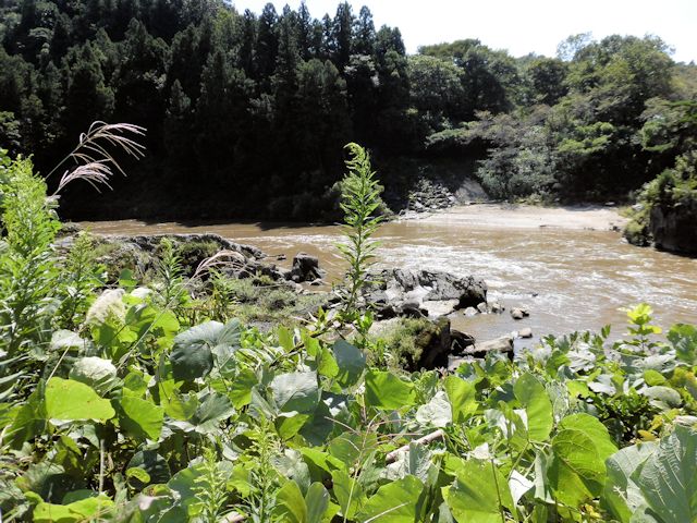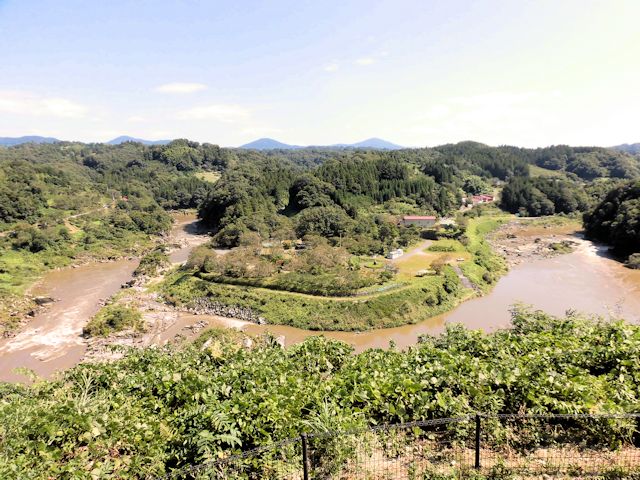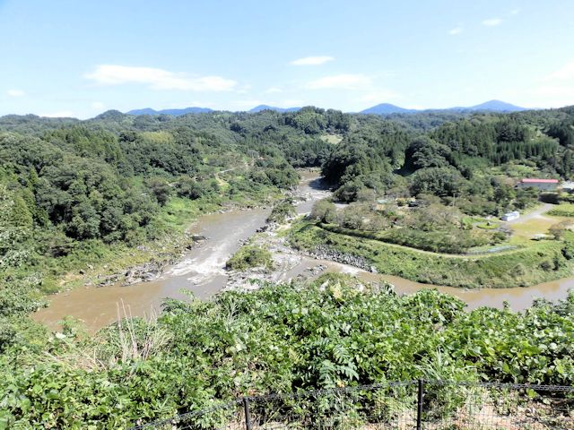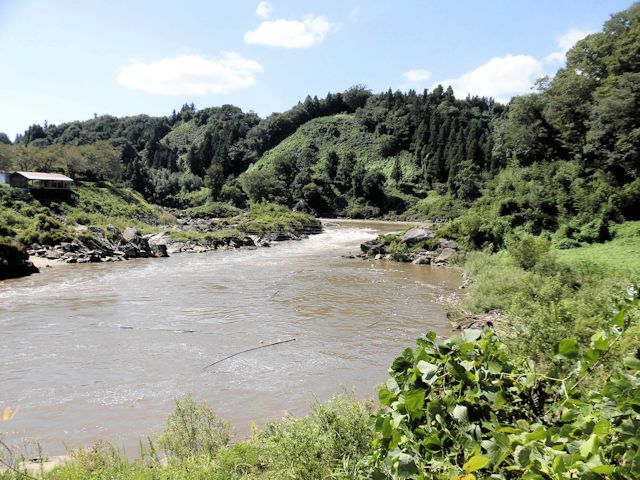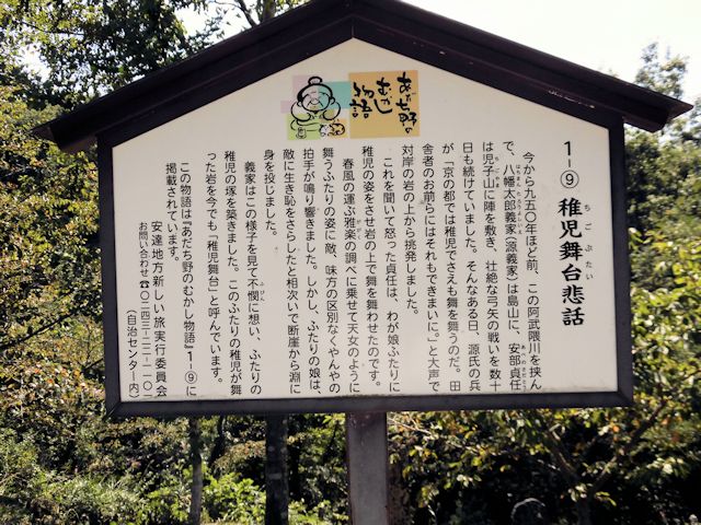 2017/09/19 二本松市周辺の城巡りも終え、本日最後の訪問先は二本松観光ガイドにも名所登録されている「稚児舞台」です。 これは勘違いしやすい名称かもしれません。 それは神社の境内などに設けられている舞台とは全く違い、阿武隈川の渓流にある奇岩怪石を舞台に悲しい物語が云い伝えられている所です。 今日は晴天にも関わらず、先日の台風18号の影響で川の色は濁流と化していました。 稚児舞台は現在公園として利用されています。 また稚児舞台より車で2分程度の場所にある展望台に登れば、阿武隈川の蛇行と稚児舞台(四季の桜・紅葉)のコラボが素晴らしく見渡せます。 [伝説] =稚児舞台= 奥州征伐に来た源義家の大軍が阿武隈川を挟んで奥州の豪族安倍貞任の軍勢と数十日も対峙(たいじ)し、弓矢の合戦を繰り返していました。 天喜3年(1055)の春、双方の兵が疲れ果てた或る日のこと、源義家の部下が「京の都では稚児さえも舞を舞うのだ。田舎者のお前らにはそれもできまい。」と挑発的な罵声を安倍貞任にあびせました。 安倍貞任は「それまで言われては一門の恥」と激怒し、自分の2人の娘を稚児姿に仕立て、大きな岩を舞台に舞を舞わせました。 2人は花に遊ぶチョウのように優雅に舞ったといいますが、舞い終わった娘たちは「敵の前に生き恥をさらしてしまった」と抱き合い淵(ふち)に身を投じてしまいました。 =稚児石= 木幡山で戦勝を得た源義家が、凱旋の迎えを受けた時岩上で舞う童児の姿を間近に見ようと川を渡ったところ、馬もろともに落下してしまいました。 馬は死にましたが、義家はけがひとつ負いませんでした。 落馬跡とその血痕が石に残り「血駒石」と言われましたが、いつしか「稚児石」と呼称されるようになったといいます。