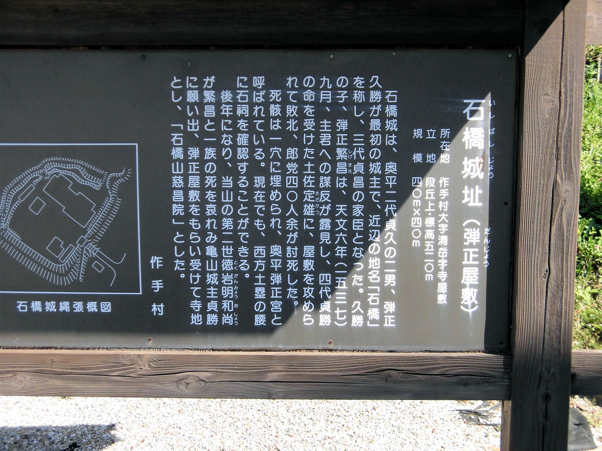 2018/04/21時刻は朝の6時過ぎです。 晴天に恵まれいよいよ今年の活動の第一歩を踏み出す日の幕開けです。 昨年2017/04/06に「続100名城」が決定して、今年の2月にガイドブックが発行されました。 第一弾の「100名城」には多くの方が旅行を兼ねて参加されています。 然し、全国津々浦々を網羅することは至難の業と云っていいほど、時間と軍資金が必要です。 それでもこつこつガイドブックに掲載されているスタンプ帳に、登録印を重ねていく楽しみは、ある意味人生の思い出の記録でもある訳です。 そして私もホームページ「旅情あふれる憩いの地」を更新しながら参加しています。 今回は私の住む愛知県にある新城市(しんしろ市)に向うことにしました。 目的は古城跡巡りです。 「長久手IC」より「新東名」を経由し「新城IC」まで向い、その後は一般道301で作手(つくで)方面ですが、やや戻るかたちなりました。 道の駅「つくで手作り村」で地域地図を確認したところ、意外と城跡が密集していたので効率よく巡ることが出来そうです。 しかもこの道の駅の道路向いに、早速「石橋城跡」を見つけました。 [ 歴史 ] 石橋城は、家康に仕え最後は中津10万石の大名となった奥平氏 (おくだいら氏) が、まだ三河の国人領主(小規模な豪族的支配者層)だった頃の一族が建てた居館跡で、「弾正屋敷」(だんじょう屋敷)とも呼ばれます。 長篠の戦いで活躍し家康に見出された奥平信昌の祖父にあたる奥平貞勝の時代、天文六年 (1537) に石橋城主だった弾正繁昌は主君に反旗を翻し謀反を起こしましたが、奥平軍に攻められ落城し討死しています。 後年になり、この地の徳岩明和尚が弾正繁昌と一族を哀れみ、近くの亀山城主だった貞勝より屋敷跡を貰い受け、寺地とし「石橋山慈昌院」を建立しました。