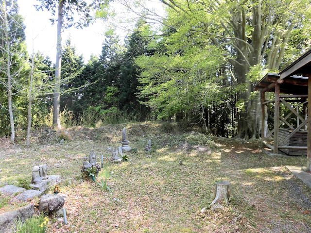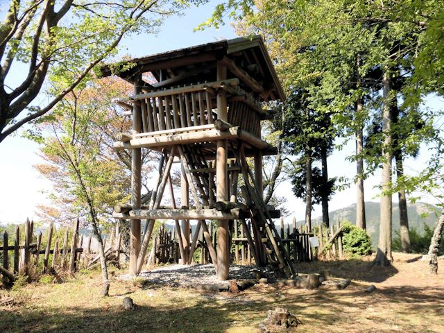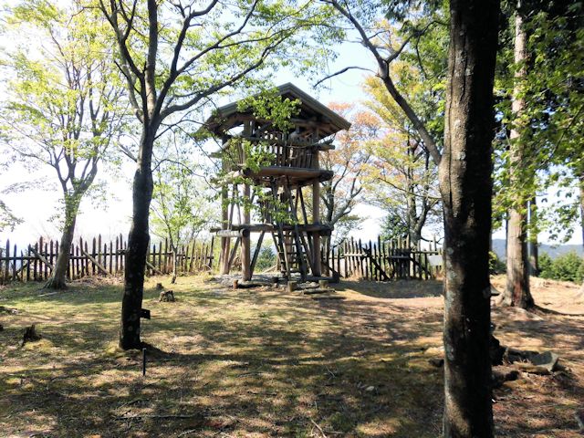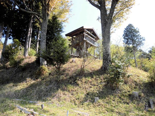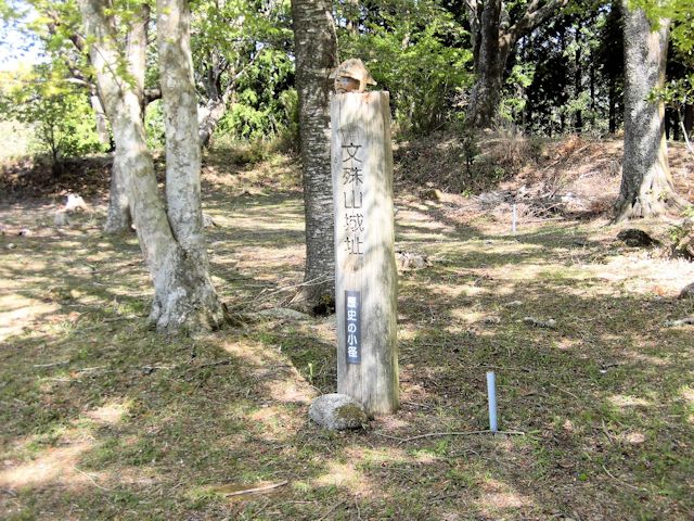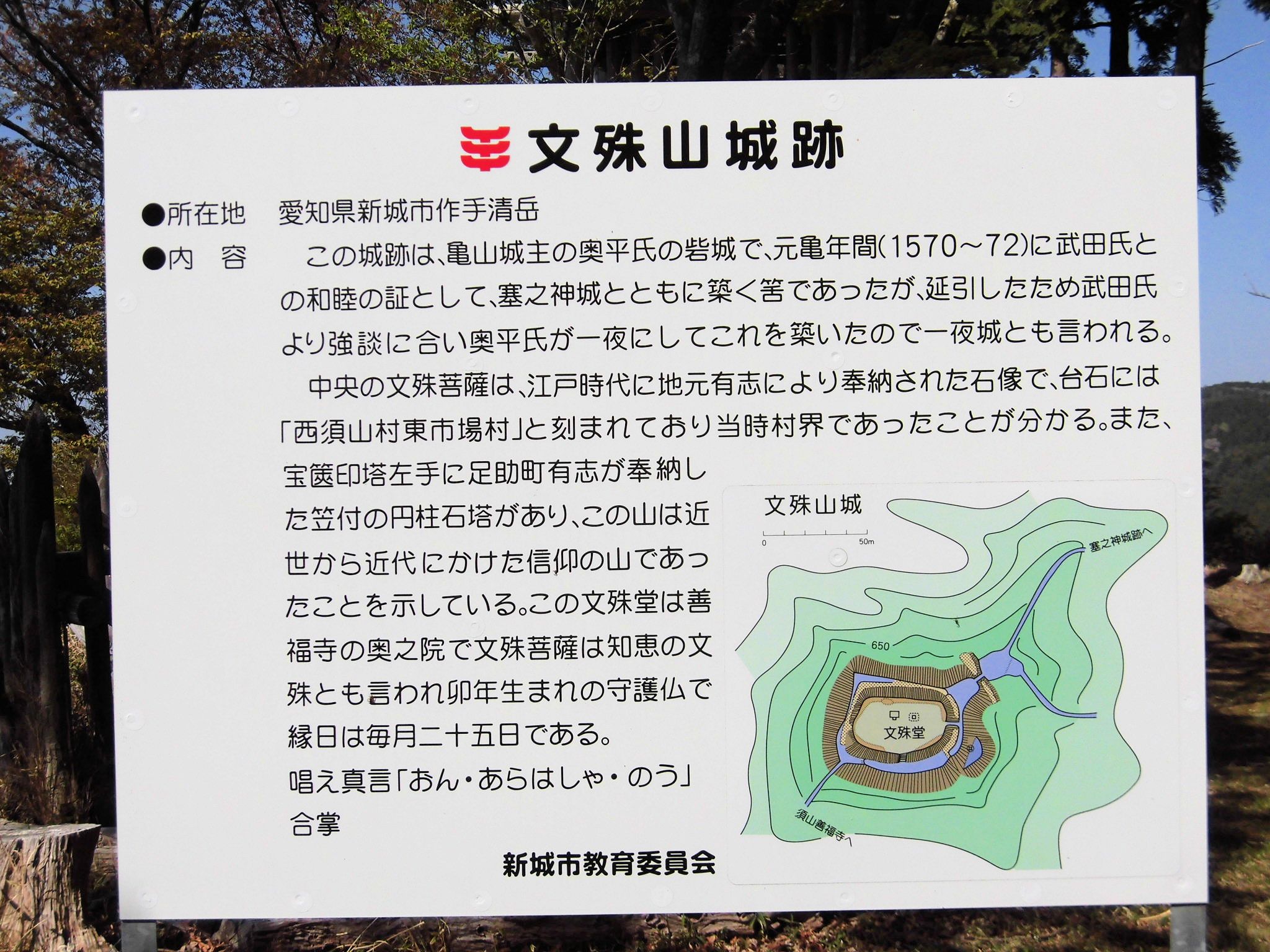 2018/04/21愛知県新城市にある道の駅「つくで手作り村」の道路向いにあった「石橋城跡」から車で、ものの10分程度の所にある小高い山の上にあります。 「石橋城跡」より方位で言いますと、北西の方角になります。 山の上には復元されたであろう木造の簡易櫓があり、眼下を見渡せるようになっています。 また城跡の中央には文殊菩薩がある程度で、周りに際立ったものがないので、散策しながら城跡を想像するのも風情かもしれません。 [ 歴史 ] 「作手亀山城」(石橋城跡より南に約200mの山頂)の城主奥平氏の砦城で、元亀年間(1570~1572)に武田氏との和睦の証として、「塞之神城」(さいのかみ城、「文珠山城」より東北東に約500mの同山系山頂) と共に築いた城です。 この「文珠山城」は奥平氏が延引(先延ばしの意味)していたのですが、武田氏より強談に合い奥平氏が一夜にしてこれを築いたので、一夜城とも呼ばれています。 城跡中央にある菩薩小屋には、立派な獅子座に乗り、周りには3人の眷族(けんぞく、血族や親族の意味)を配置した、珍しい文殊菩薩が祀られています。
